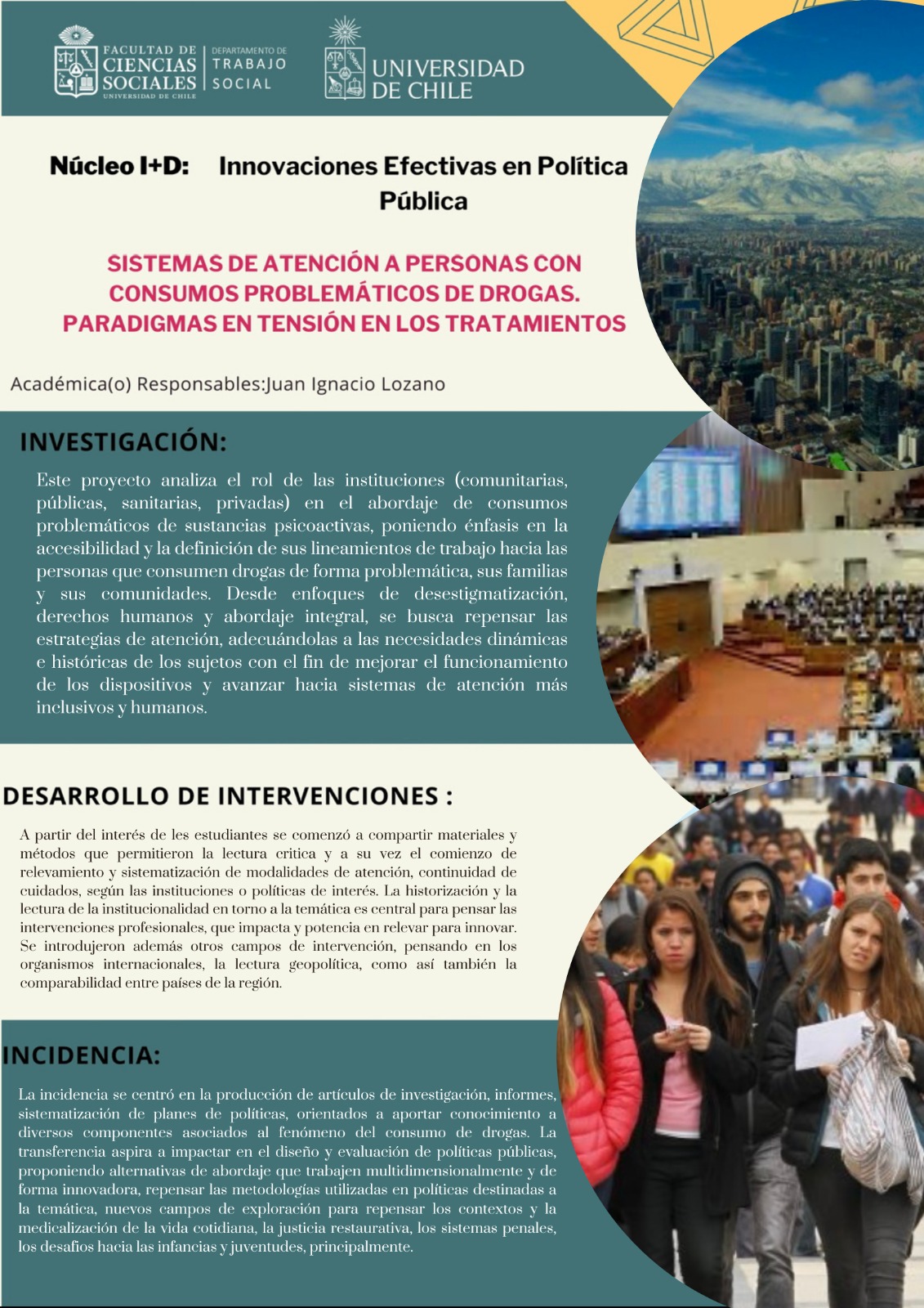 Mediante este proyecto se propone aportar elementos que permitan analizar y explicar el rol de las distintas instituciones (comunitarias, públicas, sanitarias, privadas) de abordaje de consumos problemáticos. Interesa aquí centrarnos en la accesibilidad y adecuación de éstas en un trabajo en red, como así también identificar cómo definen los lineamientos de trabajo, de respeto hacia las personas que consumen drogas de forma problemática, sus familias y sistemas de apoyo como así también sus comunidades.